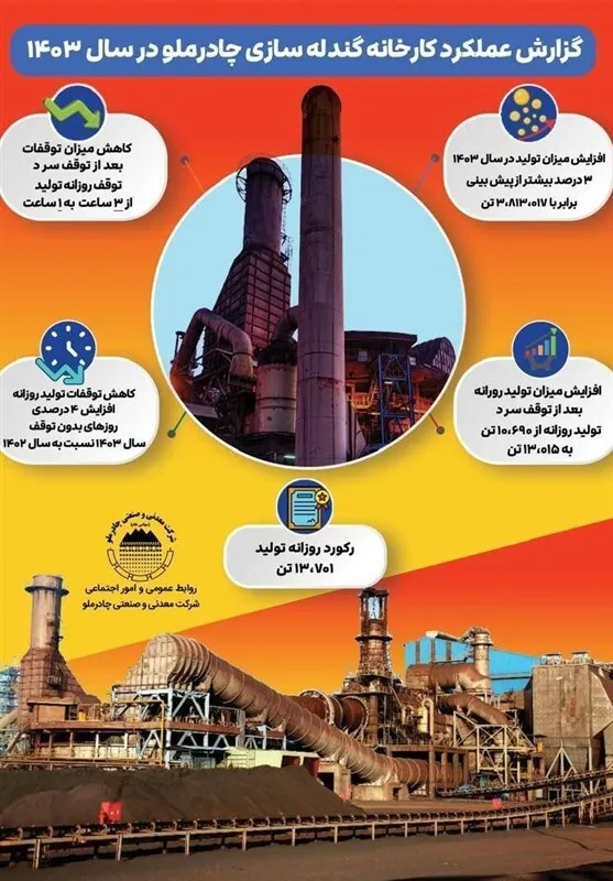 طی سال ۱۴۰۳ کارخانۀ گندله‌سازی شرکت معدنی و صنعتی چادرملو با تولید سه میلیون و هشتصد و سیزده هزار و هفده تن گندله آهن توانست سه درصد بیشتر از برنامه اعلامی به تولید برسد.