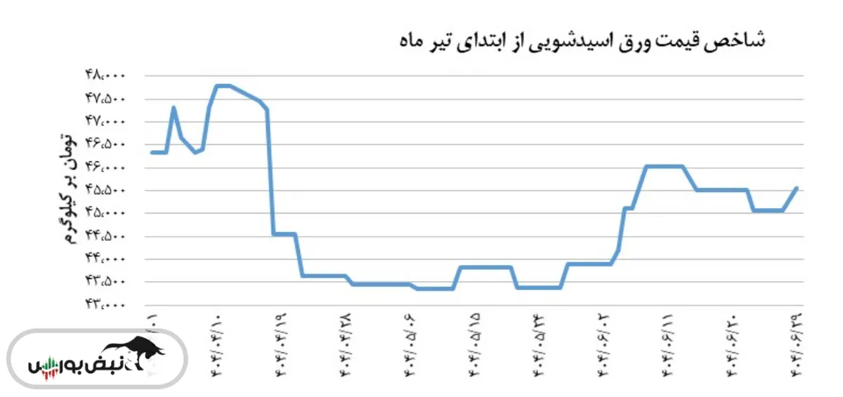 از ابتدای سال نیز شاخص قیمت ورق اسیدشویی، روندی نزولی پشت سر گذاشت؛ به طوری که از ابتدای سال شاخص قیمت ورق اسیدشویی در سطح ۵۰,۲۴۶ تومان بر کیلوگرم قرار داشت که حاکی از افت ۹٫۳ درصدی شاخص قیمت طی این دوره است. طی این دوره، بیشترین سطح شاخص مذکور در ۱۶ فروردین، و در سطح ۵۰,۲۴۶ تومان بر کیلوگرم ثبت شد. در مقابل، کمترین سطح از شاخص قیمت مورد بررسی در ۱۰ اردیبهشت، و در سطح ۴۲,۶۲۴ تومان بر کیلوگرم به وقوع پیوست. بر اساس سطوح بیشینه و کمینه ذکر شده، دامنه نوسان شاخص قیمت ورق اسیدشویی، از ابتدای سال، به حدود ۷,۶۲۲ تومان بر کیلوگرم می‌رسد.