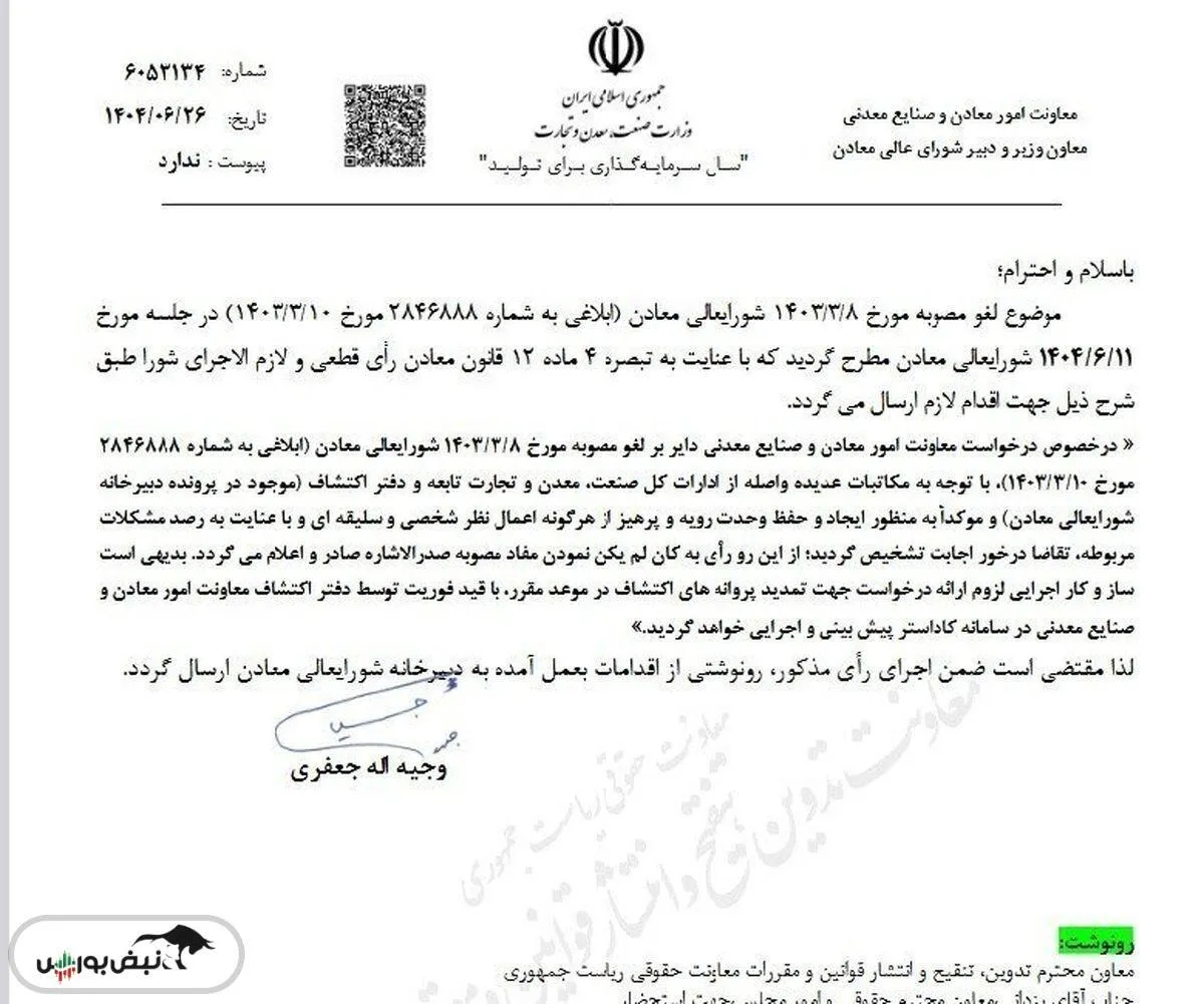 «در خصوص درخواست معاونت امور معادن و صنایع معدنی دایر بر لغو مصوبه مورخ ۱۴۰۳/۳/۸ شورایعالی معادن (ابلاغی به شماره ۲۸۴۶۸۸۸ مورخ ۱۴۰۳/۳/۱۰) با توجه به مکاتبات عدیده واصله از ادارات کل صنعت معدن و تجارت تابعه و دفتر اکتشاف موجود در پرونده دبیرخانه شورایعالی معادن و موکدا به منظور ایجاد و حفظ وحدت رویه و پرهیز از هرگونه اعمال نظر شخصی و سلیقهای و با عنایت به رصد مشکلات مربوطه، تقاضا در خور اجابت تشخیص گردید؛ از این رو رأی به کان لم یکن نمودن مفاد مصوبه صدرالاشاره صادر و اعلام میگردد. بدیهی است ساز و کار اجرایی لزوم ارائه درخواست جهت تمدید پروانههای اکتشاف در موعد مقرر با قید فوریت توسط دفتر اکتشاف معاونت امور معادن و صنایع معدنی در سامانه کاداستر پیش بینی و اجرایی خواهد گردید.»