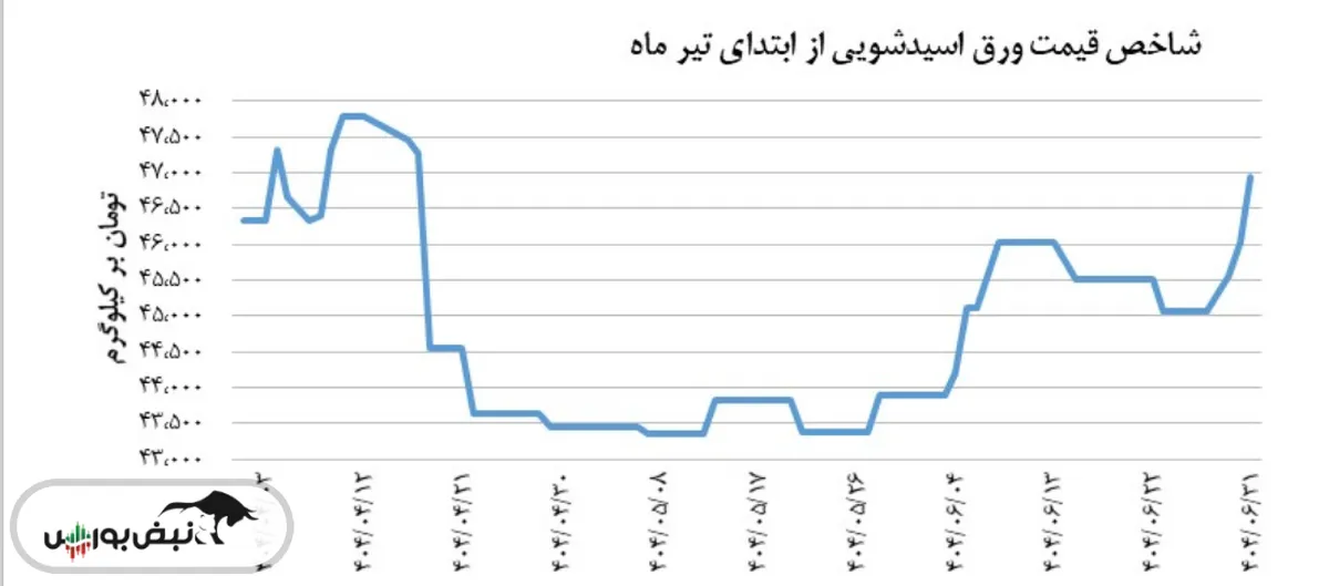 ارزیابی روند شاخص قیمت این محصول از ابتدای تیر ماه تا دیروز ۳۱ شهریور مشخص میکند که بیشترین رشد روزانه آن در ۴ تیر به وقوع پیوسته است؛ افزایشی که برابر ۲٫۱ درصد محاسبه شد. همچنین، در ۱۰ تیر، بالاترین سطح شاخص قیمت از ابتدای تیر ماه رقم خورد و شاخص قیمت به ۴۷,۷۷۵ تومان به ازای هر کیلوگرم رسید. در مقابل پایینترین سطحی که شاخص قیمت ورق اسیدشویی از ابتدای تیر ماه تجربه کرده است در تاریخ ۷ مرداد و برابر با ۴۳,۳۶۳ تومان بر کیلوگرم بوده است. بر این اساس میتوان گفت که دامنه نوسان شاخص قیمت این محصول از ابتدای تیر ماه تا به ۳۱ شهریور، حدود ۴,۴۱۲ تومان بر کیلوگرم بوده است.