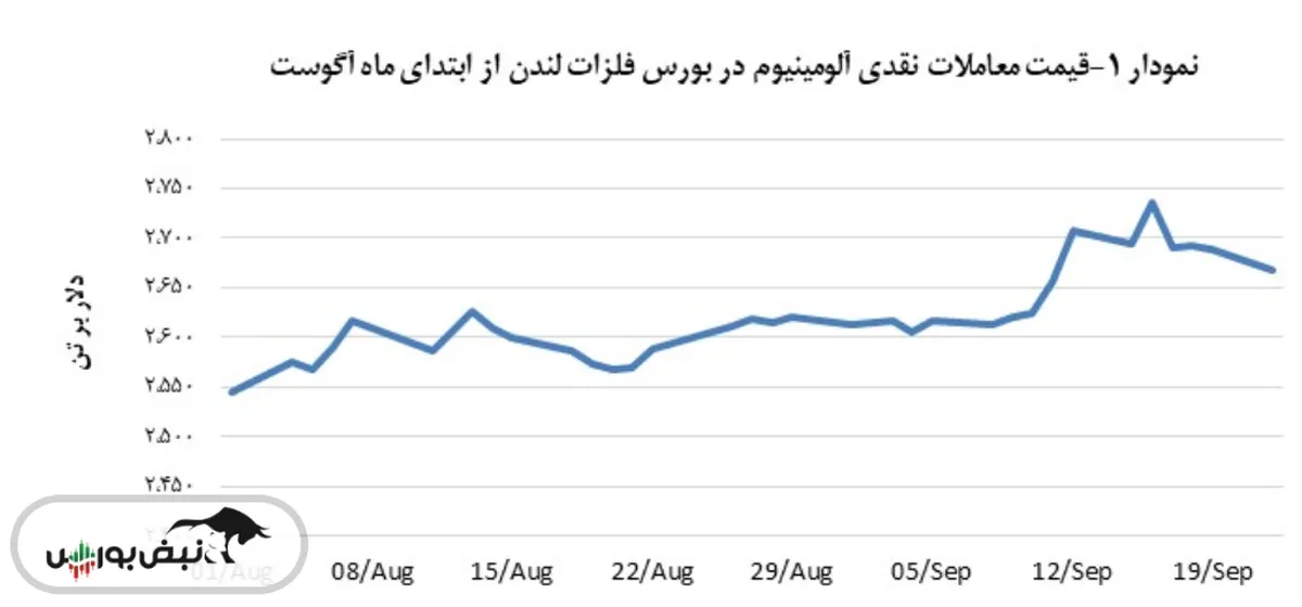 از ابتدای ماه آگوست تا دیروز ۲۲ سپتامبر (۳۱ شهریور ماه)، بالاترین نرخ ثبت‌شده برای معاملات نقدی آلومینیوم مربوط به روز سه‌شنبه ۱۶ سپتامبر (۲۵ شهریور ماه) بود؛ در این روز، بهای نقدی به ۲,۷۳۶٫۵ دلار در هر تن دست یافت. از قضا در همان تاریخ، قیمت آتی آلومینیوم نیز به اوج خود طی این برهه نایل آمد؛ رقمی که در سطح ۲,۷۱۷٫۵ دلار برای هر تن قرار داشت. افزون بر آن، نمودار قیمتی معاملات نقدی آلومینیوم از آغاز ماه آگوست تا دیروز ۲۲ سپتامبر (۳۱ شهریور ماه)، نمایان می‌سازد که در ۱ آگوست (۱۰ مرداد ماه)، این فلز پایین‌ترین نرخ خود یعنی ۲,۵۴۵٫۰ دلار بر تن را ثبت کرد. در همین روز نیز، قراردادهای آتی آلومینیوم به کمترین مقدار قیمتی در کل بازه مدنظر ریزش کرد؛ عددی که روی ۲,۵۴۷٫۰ دلار بر تن ایستاد. شایان ذکر است که در روز سه‌شنبه ۱۶ سپتامبر (۲۵ شهریور ماه)، بالاترین اختلاف قیمتی بازار آلومینیوم در طول برهه مورد مطالعه اندازه‌گیری شد. با مستقر شدن بازار در وضعیت بکواردیشن در این تاریخ، بر طبق مطالعات فلزات‌آنلاین فاصله قیمت بین معاملات نقدی و آتی به ۱۹٫۰ دلار بر تن گسترش یافت./فلزات آنلاین