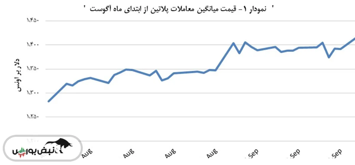 طی روزهای گذشته از اوایل آگوست، بازار پلاتین نوسانات قابل ملاحظهای را طی کرده است. به موازات این موضوع، تاریخ ۱ سپتامبر (۱۰ شهریور ماه) بهعنوان روزی شناخته میشود که میانگین روزانه قیمتها بیشترین نوسان را تجربه کرد. بهشکلی که در این تاریخ، میانگین روزانه قیمتها با رشدی نزدیک به ۴٫۲ درصد همراه شد. در همین حال، در روز ۱ آگوست (۱۰ مرداد ماه)، بازار متاثر از بیشترین فاصله قیمتی میان مبادلات نوبت صبح و عصر بود؛ قیمت هر اونس پلاتین در نوبت عصر این روز، چیزی حدود ۳۸٫۰۰ دلار بالاتر از قیمت نوبت صبح بود. افزون بر این، در میان اطلاعات قیمتی از ماه آگوست، شاخص میانگین قیمتها دیروز ۲۲ سپتامبر (۳۱ شهریور ماه) بالاترین میزان خود را با عدد ۱,۴۱۸٫۰۰ دلار به ازای هر اونس به نمایش گذاشته است، در صورتی که کمترین مقدار مربوط به روز ۱ آگوست (۱۰ مرداد ماه) است که در آن، شاخص به سطح ۱,۲۸۳٫۰۰ دلار در هر اونس افت کرده است./فلزات آنلاین