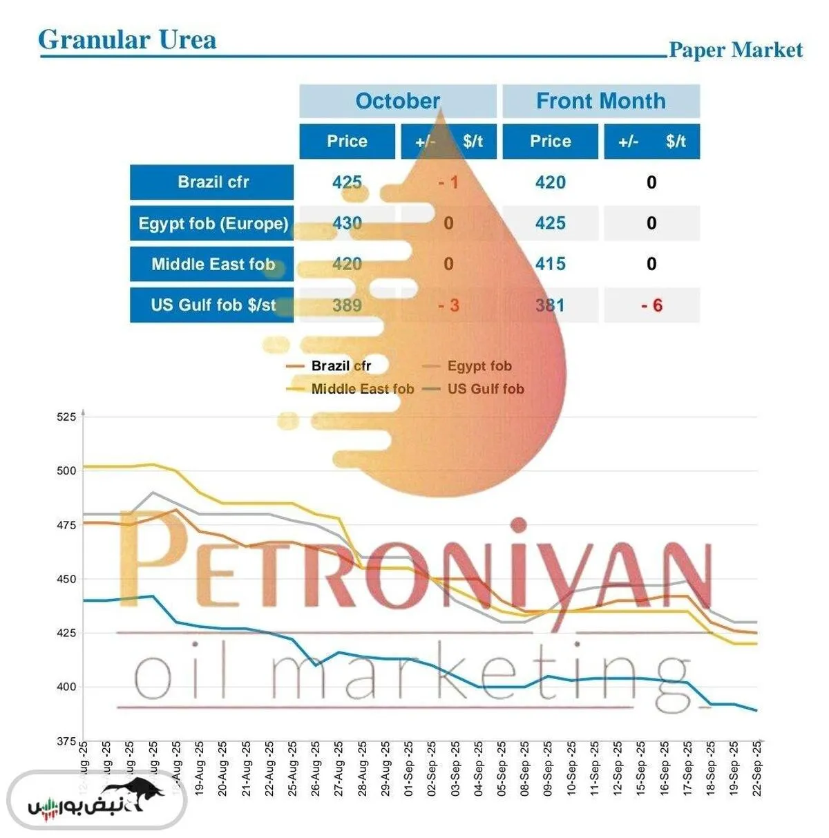 به گزارش نبض بورس، نرخ روزانه ی اوره گرانول فوب خاورمیانه، CFR برزیل، فوب مصر و خلیج ایالات متحده آمریکا، 22 سپتامبر 202
