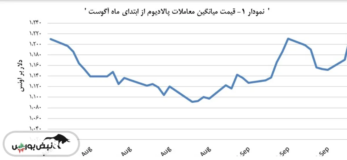 طی روزهای پیش از شروع آگوست، بازار پالادیوم نوسانات قابل توجهی را تجربه کرده است. در این فضا، میتوان بیان نمود که بیشینه نوسان در میانگین قیمتهای روزانه، مربوط به دیروز ۲۳ سپتامبر (۱ مهر ماه) است. بهطوری که میانگین قیمت پالادیوم در این روز در مقایسه با روز پیش، بالغ بر ۳٫۹ درصد بیشتر شد. در عین حال، روز ۱ آگوست (۱۰ مرداد ماه)، نقطه اوج تفاوت قیمتی بین دو نوبت داد و ستدی صبح و عصر بهحساب میآید؛ در این روز، نرخ داد و ستد عصر بالغ بر ۳۵٫۰۰ دلار بر اونس بالاتر از بهای نوبت صبح بود. اضافه بر این، روند نوسانات میانگین قیمت از ابتدای ماه آگوست نمایان میسازد که این شاخص دیروز ۲۳ سپتامبر (۱ مهر ماه)، با ثبت رقم ۱,۲۱۶٫۵۰ دلار برای هر اونس، در بیشترین سطح خود جای داشته است، در حالی که پایینترین مقدار برآورد شده برای این شاخص، متعلق به ۲۶ آگوست (۴ شهریور ماه) و میزانی برابر با ۱,۰۹۱٫۵۰ دلار به ازای هر اونس داشته است./فلزات آنلاین