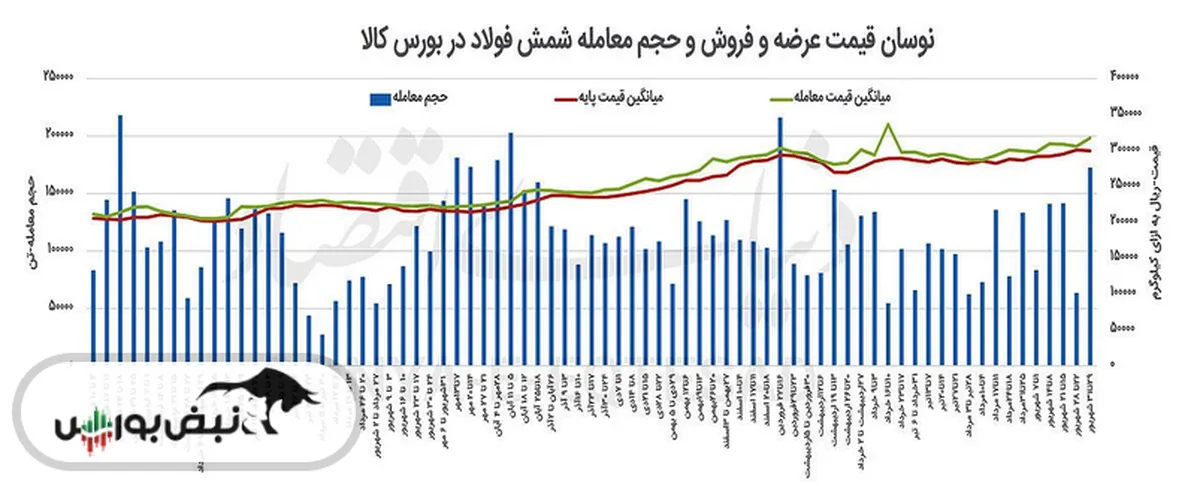 بررسی معاملات نشان میدهد که بورس کالای ایران میزبان عرضه ۱۹۴ هزار و ۶۱۵ تن شمش بود که با توجه به ثبت تقاضای ۲ برابری نسبت به عرضه ۸۸ درصد از عرضهها مورد معامله قرار گرفت. قیمت میانگین موزون شمش در معاملات روز ۳۱ شهریورماه ۳۱ هزار و ۷۴۲ تومان بهازای هر کیلوگرم بود که رشد ۳.۶ درصدی را نسبت به هفته گذشته گزارش میکند. همچنین بررسی رینگ فیزیکی نشان میدهد که میزان معاملات در روز مورد بررسی نسبت به هفته گذشته افزایش ۶۳درصدی داشته است. قیمت پایه تعیین شده برای عرضههای شمش در بازه ۲۹ هزار و ۱۹۳ تومان تا ۳۰ هزار و ۷۳۰ تومان بهازای هر کیلوگرم تعیین شد و بهطور کلی میانگین قیمت پایه در هفته پایانی شهریورماه نسبت به هفته گذشته افت ۰.۴ درصدی را به ثبت رساند.