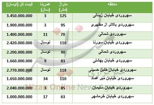 هزینه خرید آپارتمان در منطقه سهروردی/جدول