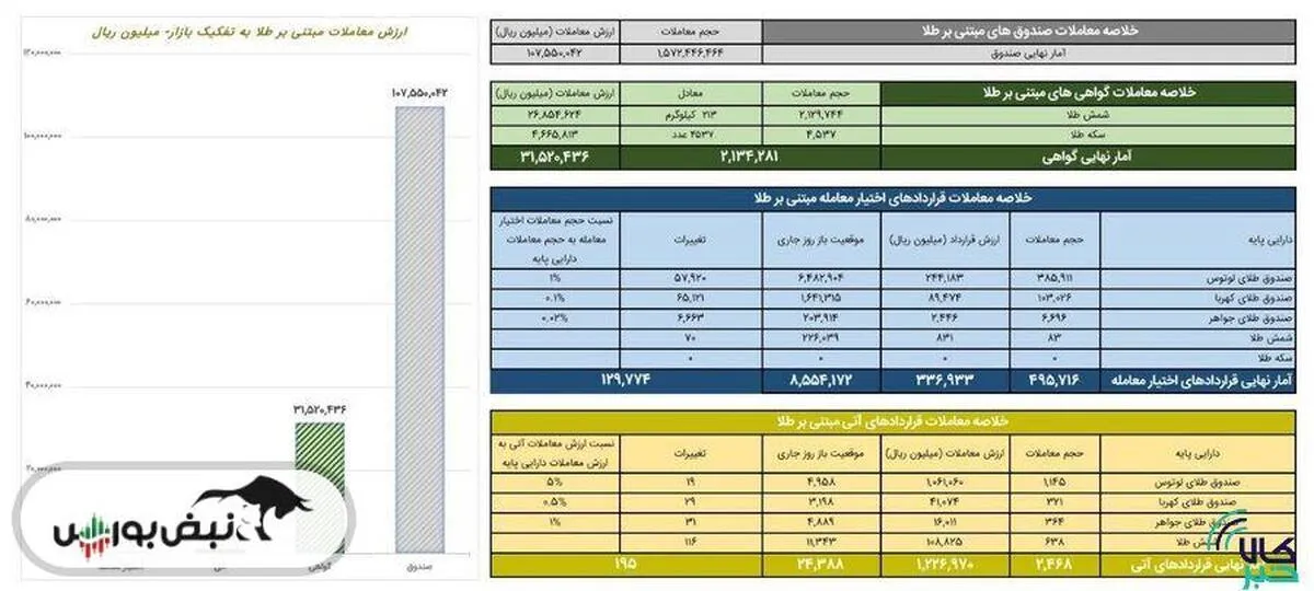 روز گذشته در مجموع یک میلیارد و ۵۷۲ میلیون و ۴۴۶ هزار و ۴۶۴ واحد صندوق طلا به ارزش ۱۰.۷ همت در بورس کالا معامله شد