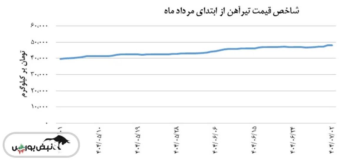 ارزیابی روند شاخص قیمت این محصول از ابتدای مرداد ماه تا ۲ مهر نشان میدهد که بیشترین جهش روزانه آن در ۱۴ مرداد به وقوع پیوسته است؛ جهشی که معادل ۱٫۶ درصد محاسبه شد. از طرف دیگر، در ۲ مهر، بالاترین سطح شاخص قیمت از ابتدای مرداد ماه ثبت شد و شاخص قیمت به ۴۸,۱۴۴ تومان به ازای هر کیلوگرم دست یافت. در مقابل پایینترین سطحی که شاخص قیمت تیرآهن از ابتدای مرداد ماه تجربه کرده است در تاریخ ۱ مرداد و برابر با ۳۹,۷۱۴ تومان بر کیلوگرم بوده است. بنابراین میتوان اذعان کرد که دامنه تغییرات شاخص قیمت این محصول از ابتدای مرداد ماه تا به امروز ۲ مهر، حدود ۸,۴۳۰ تومان بر کیلوگرم بوده است.