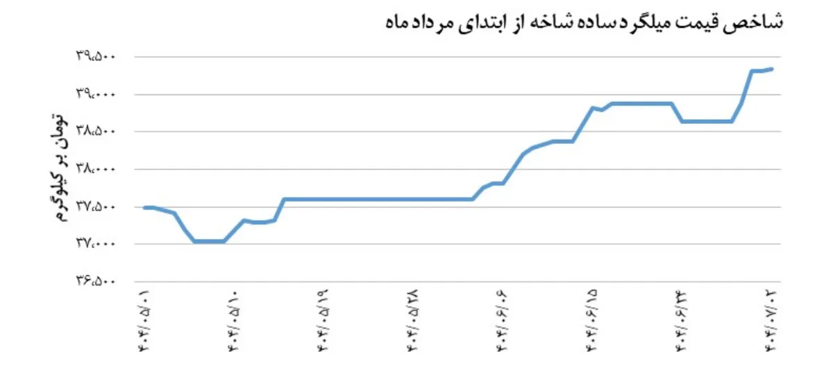 بررسی روند شاخص قیمت این محصول از ابتدای مرداد ماه تا ۲ مهر مشخص می‌کند که بیشترین افزایش روزانه آن در ۳۱ شهریور به وقوع پیوسته است؛ افزایشی که معادل ۱٫۱ درصد اندازه‌گیری شد. همچنین، در ۲ مهر، رکورد بالاترین سطح شاخص قیمت از ابتدای مرداد ماه ثبت شد و شاخص قیمت به ۳۹,۳۴۷ تومان به ازای هر کیلوگرم دست یافت. در مقابل پایین‌ترین سطحی که شاخص قیمت میلگرد ساده شاخه طی دوره مورد بررسی تجربه کرده است در تاریخ ۶ مرداد و برابر با ۳۷,۰۳۷ تومان بر کیلوگرم بوده است. بدین ترتیب می‌توان اذعان کرد که دامنه نوسان شاخص قیمت این محصول از ابتدای مرداد ماه تا به امروز ۲ مهر، حدود ۲,۳۱۰ تومان بر کیلوگرم بوده است.