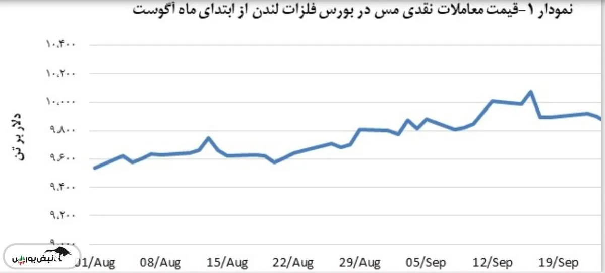 به گزارش نبض بورس، ۲۵ سپتامبر (۳ مهر ماه)، هر تن مس در معاملات نقدی بورس فلزات لندن به بهای ۱۰,۳۱۲٫۰ دلار معامله شد که در مقایسه با روز گذشته حدود ۴٫۶ درصد با رشد روبه‌رو شد. با این وجود، این رقم در مبادلات هفته قبل معادل با ۹,۸۹۵٫۰ دلار در هر تن مس بود. بر این اساس، بر طبق بررسی‌های فلزات‌آنلاین قیمت نقدی مس طی یک هفته اخیر ۴۱۷٫۰ دلار به ازای هر تن بالا رفته و این به معنای رشد ۴٫۲ درصدی است.
