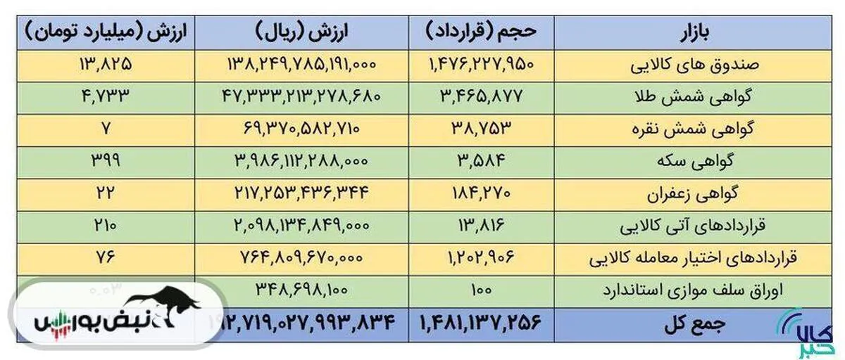 در این رکوردشکنی از بین هشت بازار مالی و مشتقه بورس کالا، بیشترین سهم با ارزش ۱۳.۸ همت متعلق به صندوقهای کالایی بود. پس از صندوقهای کالایی، گواهی شمش طلا با ۳ میلیون و ۴۶۵ هزار قرارداد به ارزش بیش از ۴.۷ همت در جایگاه دوم قرار گرفت.