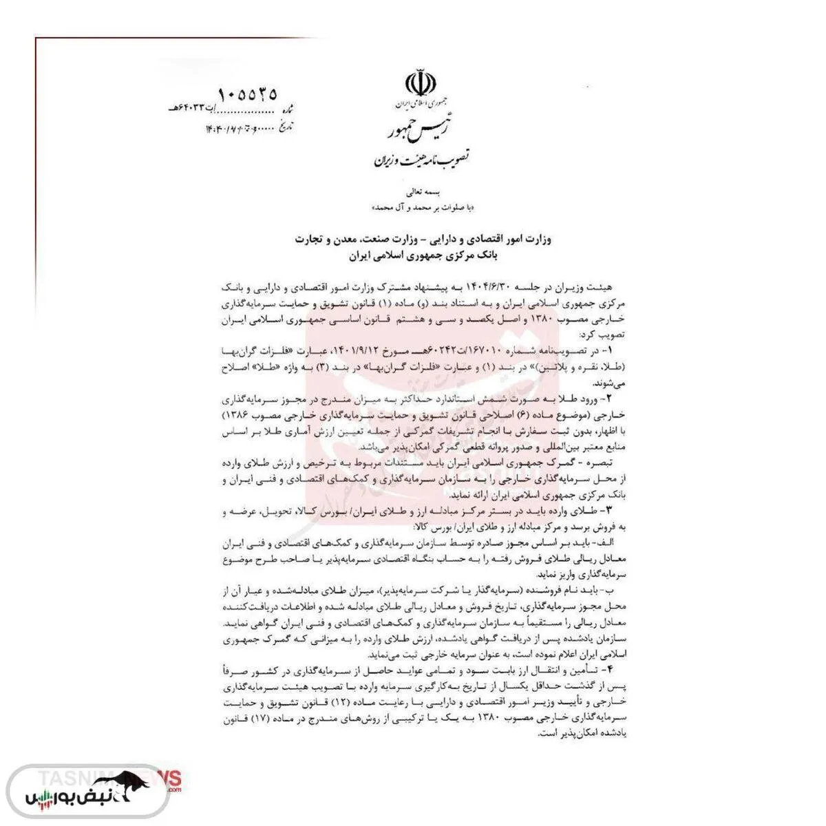 به گزارش نبض بورس، معاون اول رئیسجمهور، مصوبهای را ابلاغ کرد تا سرمایهگذاران خارجی بتوانند شمش استاندارد طلا را وارد کشور، در بورس کالا یا مرکز مبادله ارز و طلا عرضه کنند.