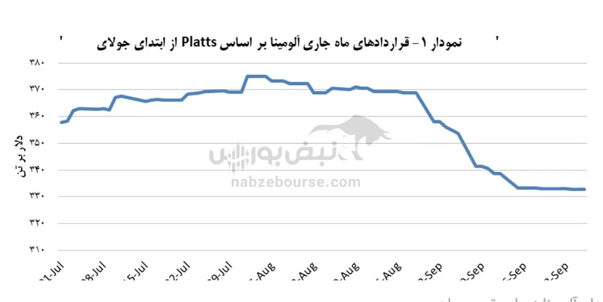 همجهت با افت بهای قراردادهای ماه جاری، میانگین قیمت مبادلات ۳ماهه آلومینا در هفته منتهی به روز جمعه ۲۶ سپتامبر (۴ مهر ماه) نیز نسبت به هفته قبل با کاهشی ۱٫۶ درصدی مواجه شد و در سطح ۳۲۲٫۰ دلار بر تن ایستاد. شایان ذکر است که در حالی که یک ماه پیشین قیمت معاملات ۳ماهه آلومینا در سطح ۳۶۵٫۳ دلار در هر تن جای داشت، ارزیابیها نمایان میسازد که این میزان طی چهار هفته اخیر، با افتی ۱۱٫۹ درصدی روبهرو شده است.