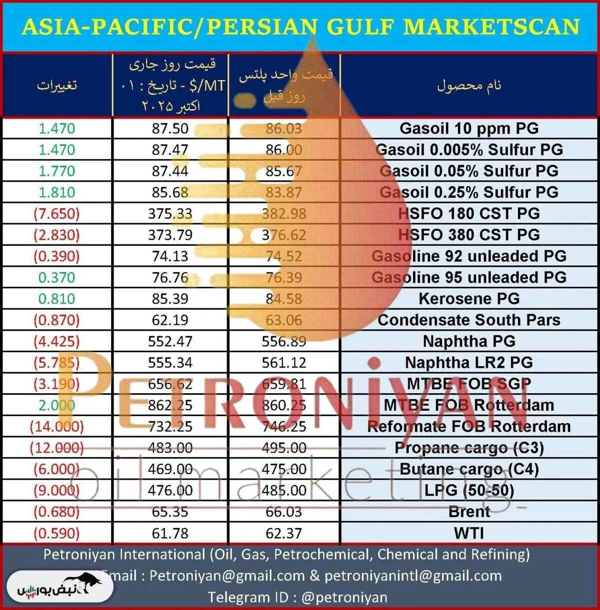 نرخ روزانهی فرآوردههای نفتی نشریه پلتس، یکم اکتبر ۲۰۲۵
