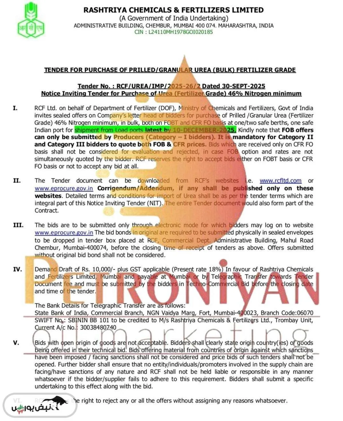 به گزارش نبض بورس، شرکت RCF مناقصهای برای واردات ۲ میلیون تن اوره پریل/گرانوله برای ارسال تا ۱۰ دسامبر صادر کرد.|پیشنهادات باید تا ساعت ۱۱:۰۰ به وقت IST در ۱۵ اکتبر ارائه شوند و تا ۳۰ اکتبر معتبر خواهند بود.|این مناقصه شامل تحویل ۱ میلیون تن به ساحل غربی و ۱ میلیون تن به ساحل شرقی است.