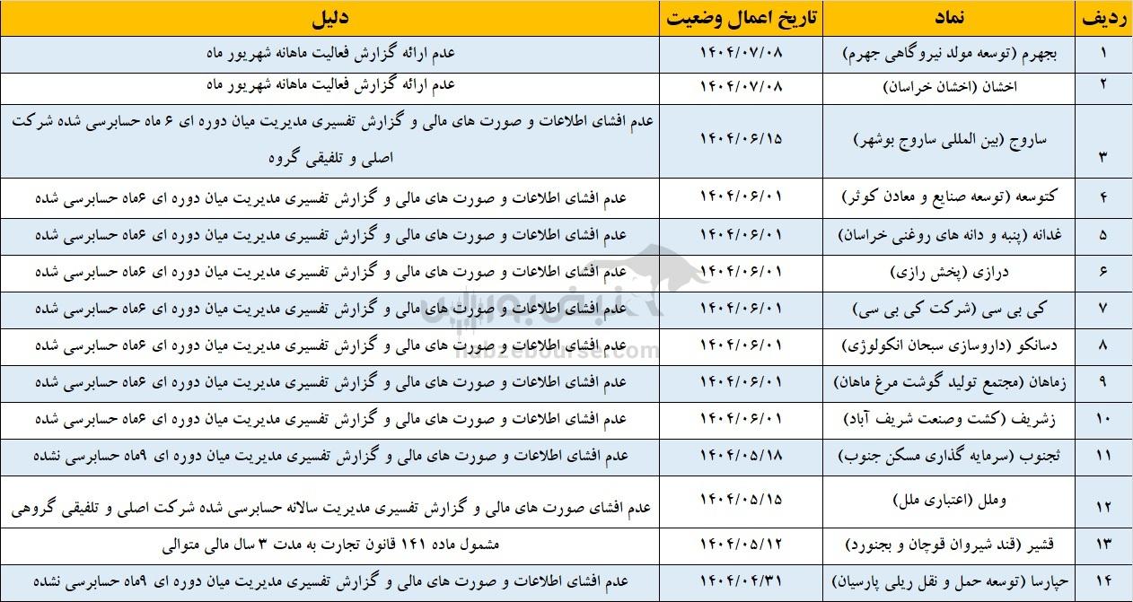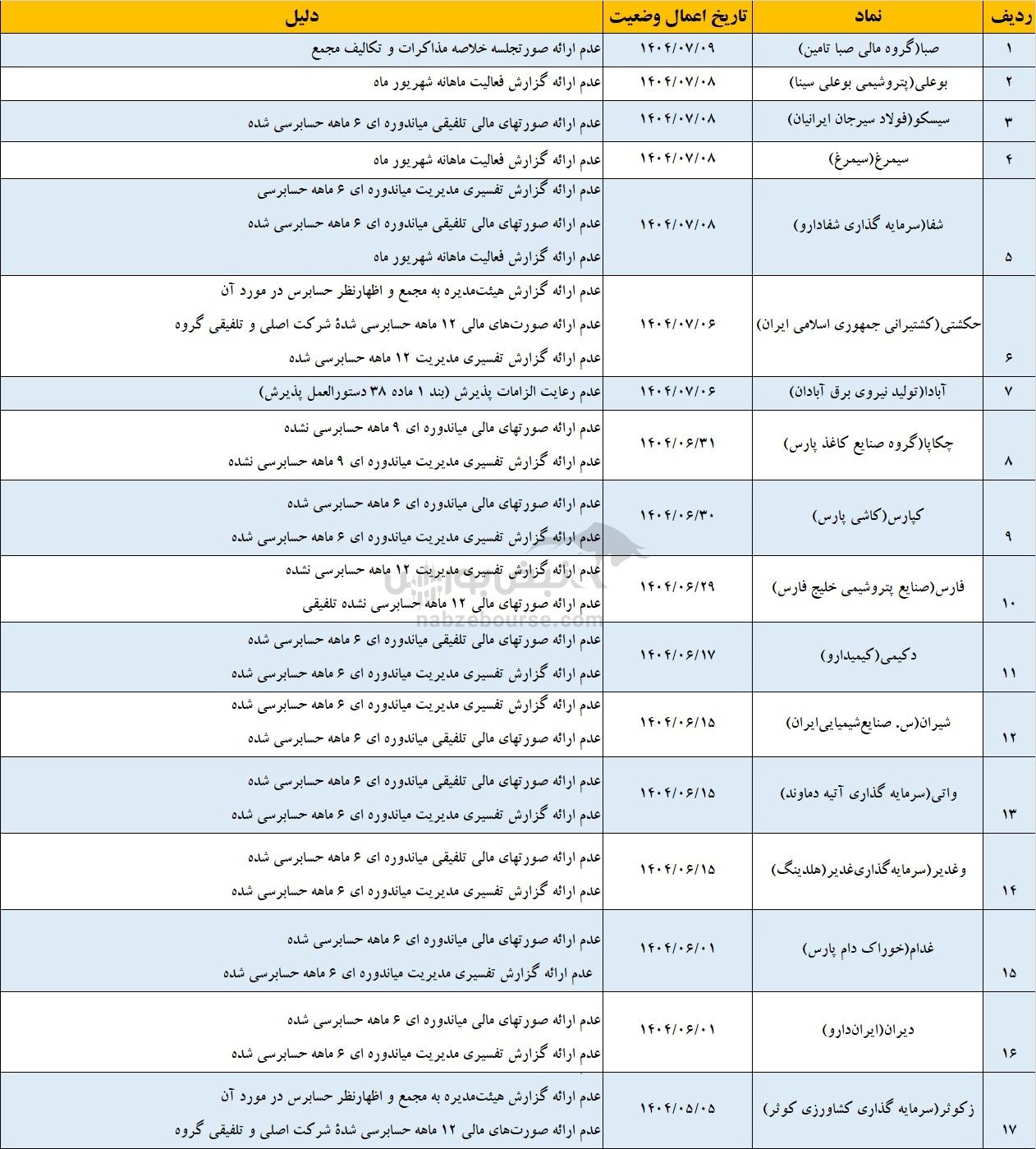 همان گونه که ملاحظه می گردد به گفته شرکت بورس ایران،۱۷ نماد بنا به دلایل مختلفی مشمول فرآیند تعلیق شده اند و این نمادها در صورت رفع این دلایل از فهرست مشمولین فرآیند تعلیق خارج خواهند شد و در صورت عدم رفع، حکم تعلیق آن ها صادر خواهد شد. بنابراین باید سهامداران مراقب این نمادها باشند.