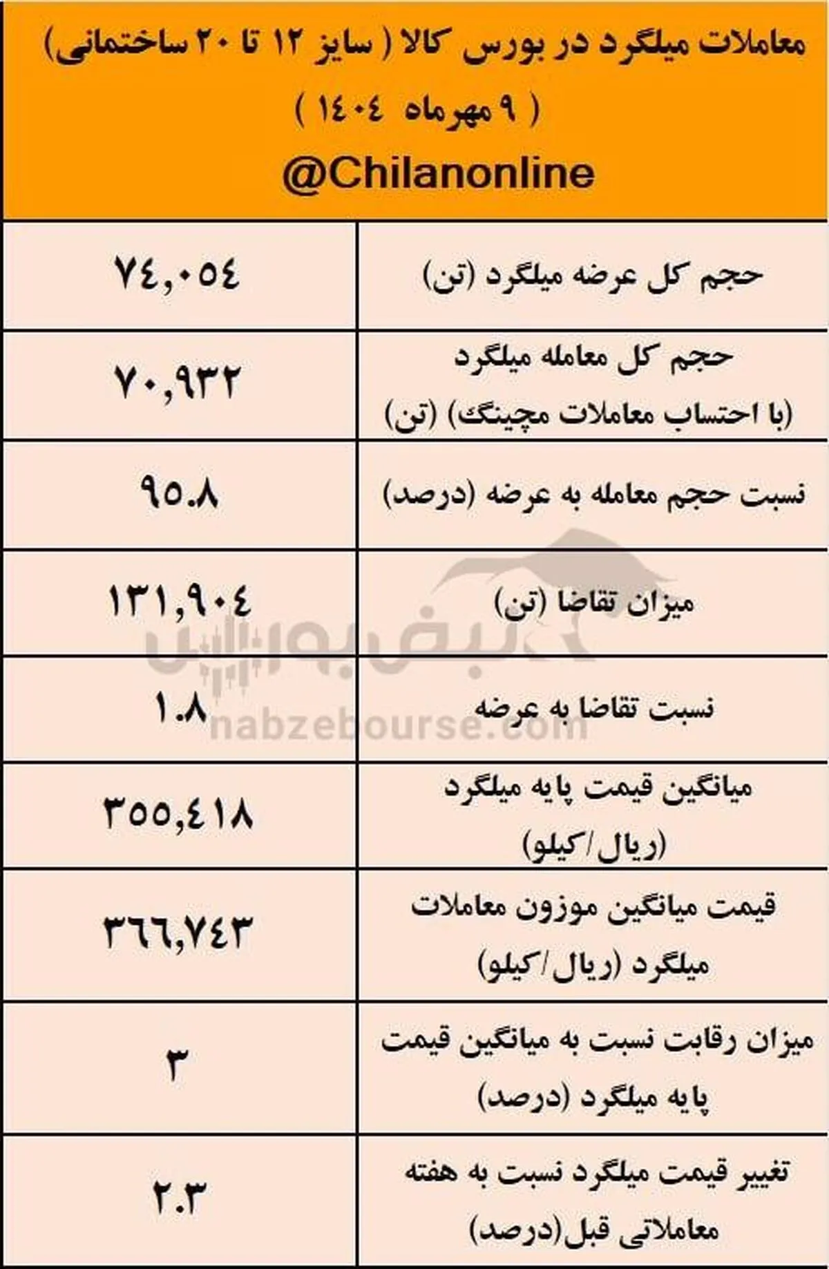 به گزارش نبض بورس، ۹ مهر ماه ۱۴۰۴، ۷۴ هزارتن میلگرد پرمصرف ساختمانی (سایز ۱۲ تا ۲۰) در بورس کالا عرضه شد که با احتساب معاملات مچینگ،۷۰ هزارتن معادل ۹۵ درصد از این عرضهها مورد معامله قرار گرفت.