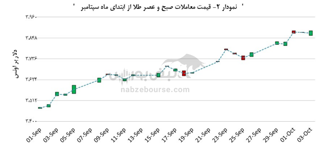 با آن که قیمت در نوبت صبح افت داشت، در نوبت عصر برخلاف آن سیر، قیمت در مقایسه با روز پیش افزایش داشت و در نهایت، دیروز ۳ اکتبر (۱۱ مهر ماه) با رشد ۷٫۶۰ دلار بر اونسی به ۳,۸۸۵٫۷۰ دلار برای هر اونس نایل آمد. شواهد نشان میدهد که در حین دیروز ۳ اکتبر (۱۱ مهر ماه) سیر پیشروی بازار دچار چرخش شده است.بازار در داد و ستد دیروز ۳ اکتبر (۱۱ مهر ماه) بهای عصرگاهی را به طرف جایگاهی بالاتر از بهای صبح سوق داده است و آنگونه که از مجموع معاملات پیدا است، طلا در این روز مسیری افزایشی تجربه کرده است.