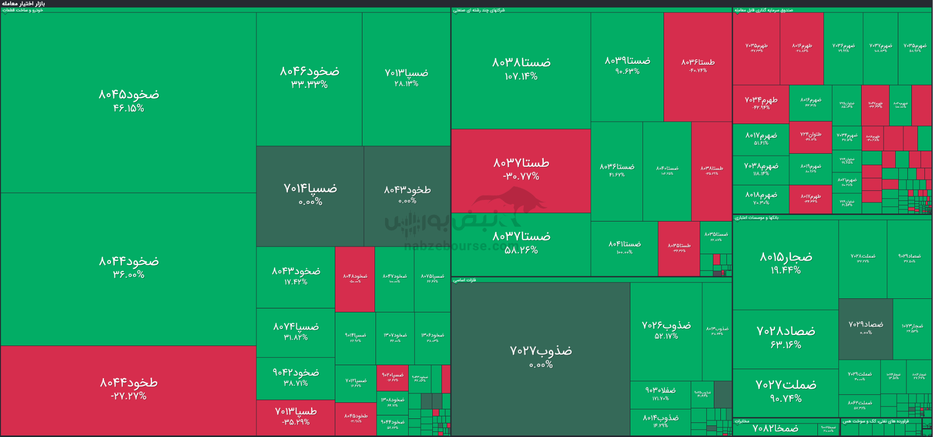 همچنین در نماد‌های با ارزش معاملات بالای یک میلیارد تومان ضهرم ۷۰۳۸، ضهرم ۸۰۲۱، ضهرم ۷۰۳۷، ضهرم ۸۰۳۸ و ضستا ۸۰۴۰ بالاترین نوسان مثبت روزانه به ثبت رساندند و همچنین طهرم ۷۰۳۵، طهرم ۷۰۳۶، طهرم ۷۰۳۷، طهرم ۷۰۳۴، طستا ۸۰۳۶ بالاترین درصد منفی نوسان روزانه را به خود اختصاص دادند.