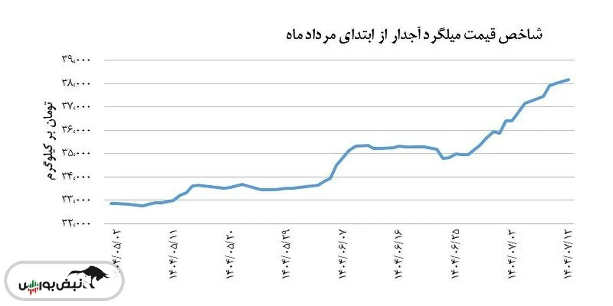 ارزیابی روند شاخص قیمت این محصول از ابتدای مرداد ماه تا ۱۲ مهر نشان می‌دهد که بیشترین رشد روزانه آن در ۶ شهریور رخ داده است؛ افزایشی که معادل ۱٫۶ درصد اندازه‌گیری شد. همچنین، در ۱۲ مهر، رکورد بالاترین سطح شاخص قیمت طی دوره مورد بررسی یعنی از ابتدای مرداد ماه ثبت شد و شاخص قیمت به ۳۸,۱۸۸ تومان به ازای هر کیلوگرم دست یافت. در مقابل پایین‌ترین سطحی که شاخص قیمت میلگرد آجدار طی دوره مورد بررسی تجربه کرده است در تاریخ ۶ مرداد و برابر با ۳۲,۷۵۸ تومان بر کیلوگرم بوده است. بنابراین می‌توان اذعان کرد که دامنه نوسان شاخص قیمت این محصول از ابتدای مرداد ماه تا به امروز ۱۲ مهر، حدود ۵,۴۳۰ تومان بر کیلوگرم بوده است.