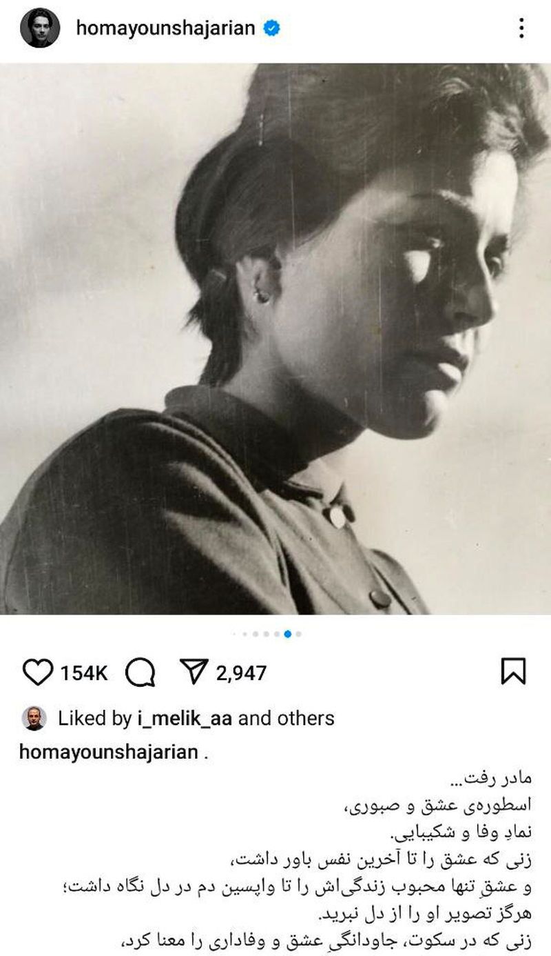 به گزارش نبض بورس، مادر همایون شجریان و همسر محمدرضا شجریان درگذشت. همایون شجریان با انتشار مطلبی در فضای مجازی از درگذشت مادرش خبر داد.
