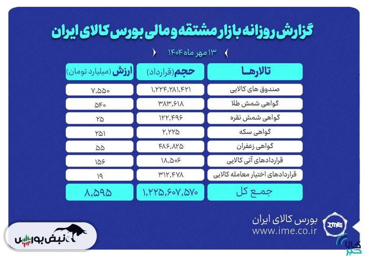همچنین در معاملات روز۱۳ مهر ماه بازار مشتقه و مالی، یک میلیارد و ۲۲۴ میلیون و ۲۸۱ هزار و ۴۲۱ واحد صندوق کالایی به ارزش ۷ هزار و ۵۵۰ میلیارد تومان دست به دست شد.