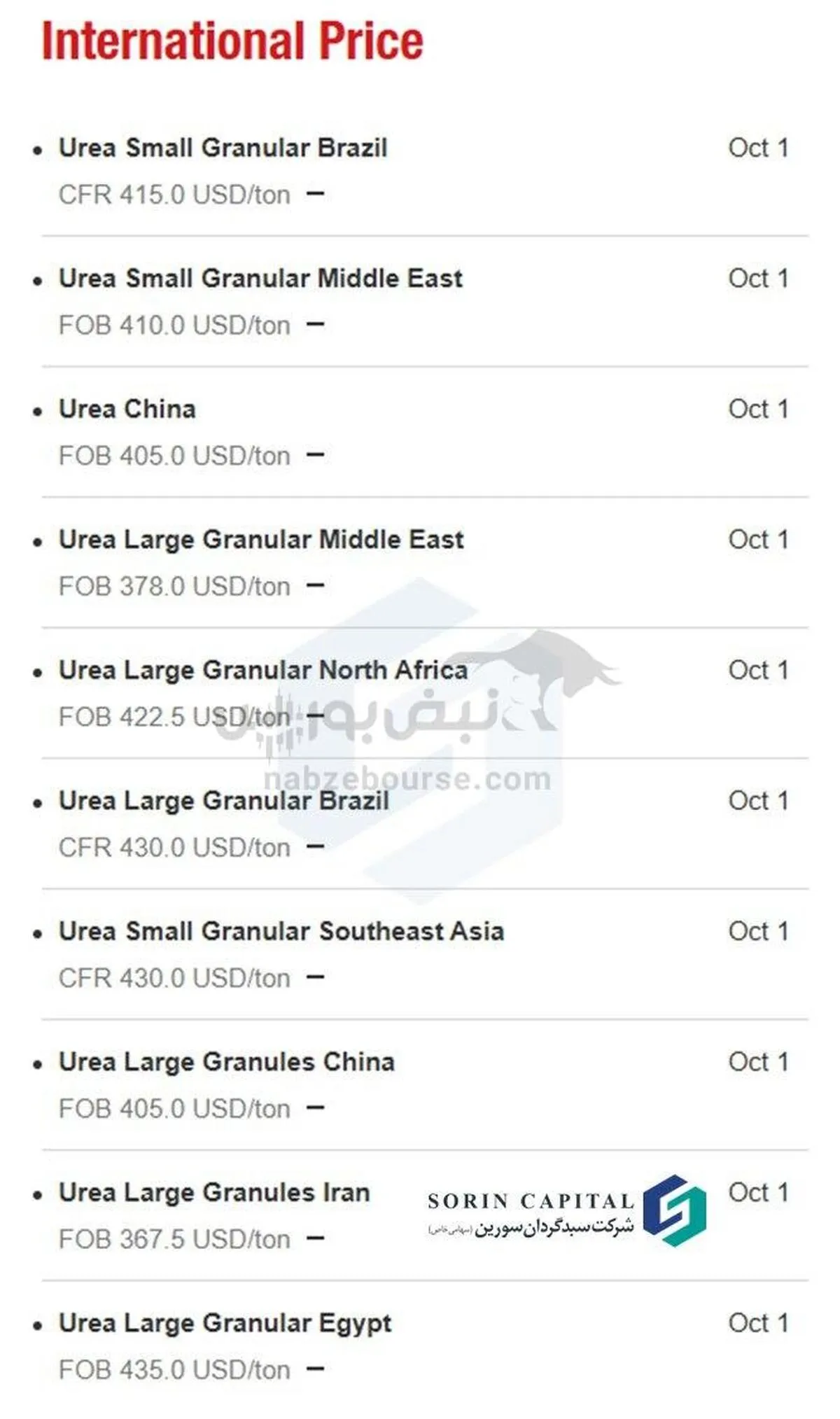 به گزارش نبض بورس، قیمتهای جهانی اوره در نخستین روز اکتبر در محدوده FOB 367 تا 435 دلار نوسان دارد.