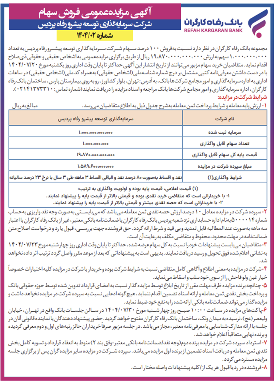 دراستای اجرای ماده 13 دستورالعمل اجرائی افشای اطلاعات شرکت های ثبت شده نزد سازمان بورس و اوراق بهادار به استحضار می رساند با توجه به تکالیف مقرر در ماده 16 قانون رفع موانع تولید رقابت پذیر و ارتقای نظام مالی کشور، تعداد 1،000،000،000 سهم ( یک میلیارد سهم )، معادل 100 درصد از سهام شرکت سرمایه گذاری توسعه پیشرو رفاه پردیس به ارزش 19،870،000،000،000 ریال (معادل 1987 میلیارد تومان ) به صورت یکجا و با شرایط نقد و اقساط به اشخاص حقیقی و حقوقی عرضه خواهد شد.