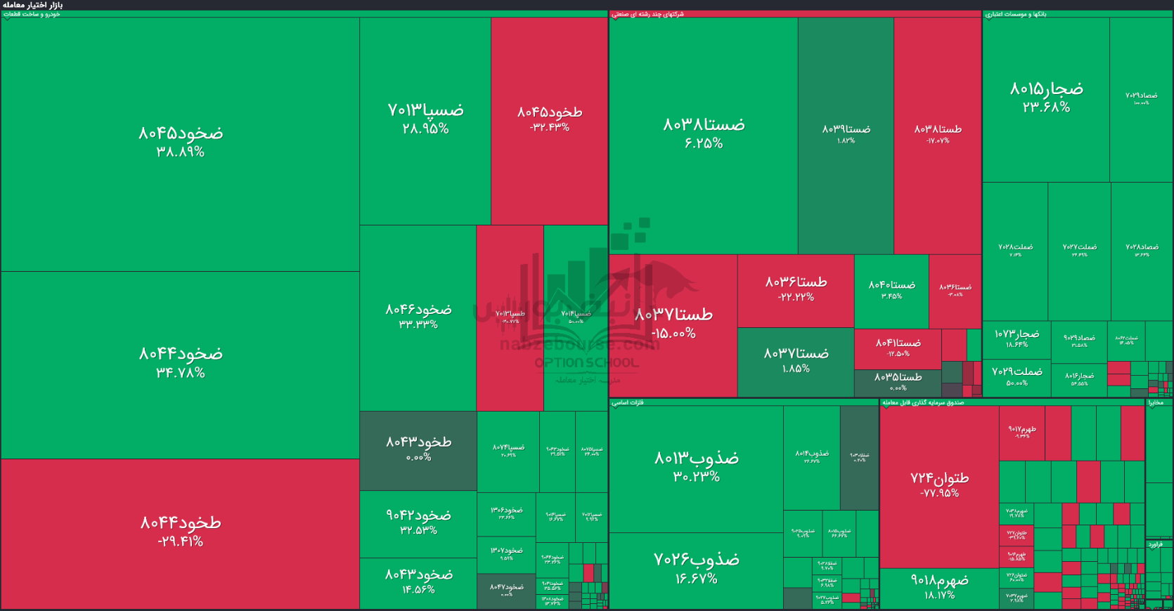 همچنین در نماد‌های با ارزش معاملات بالای یک میلیارد تومان ضخود ۸۰۴۵، ضخود ۸۰۴۴، ضخود ۹۰۴۲، ضذوب ۸۰۱۳ و ضخود ۹۰۴۳ بالاترین نوسان مثبت روزانه به ثبت رساندند و همچنین طهرم ۷۰۳۵، طهرم ۷۰۳۴، طهرم ۷۰۳۶، طهرم ۸۰۱۶ و طخود ۸۰۴۵ بالاترین درصد منفی نوسان روزانه را به خود اختصاص دادند.