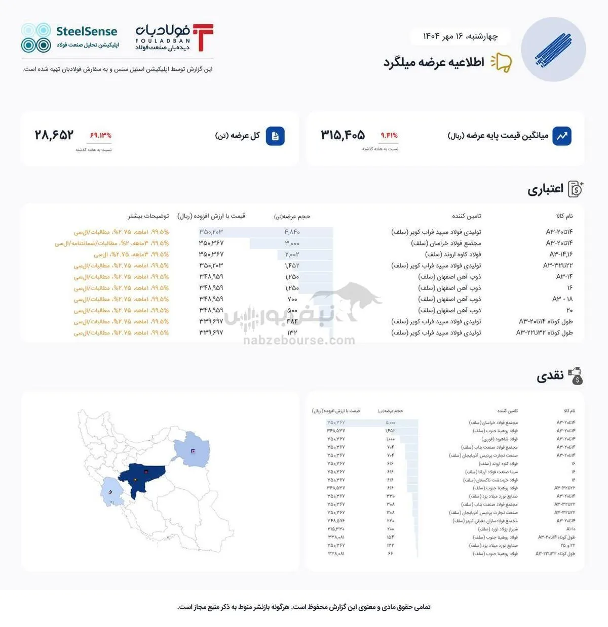 به گزارش نبض بورس، بر اساس جدیدترین اطلاعیه عرضه بورس کالا، امروز چهارشنبه 16 مهر 1404؛ 28 هزار و 652 تن میلگرد در بورس کالا عرضه شد.