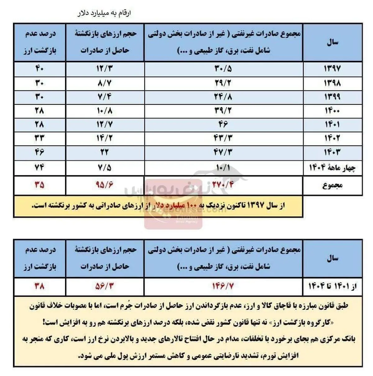 این میزان عدم بازگشت ارز صادراتی شامل بیش از ۳۵ درصد کل صادرات غیرنفتی کشور می شود.