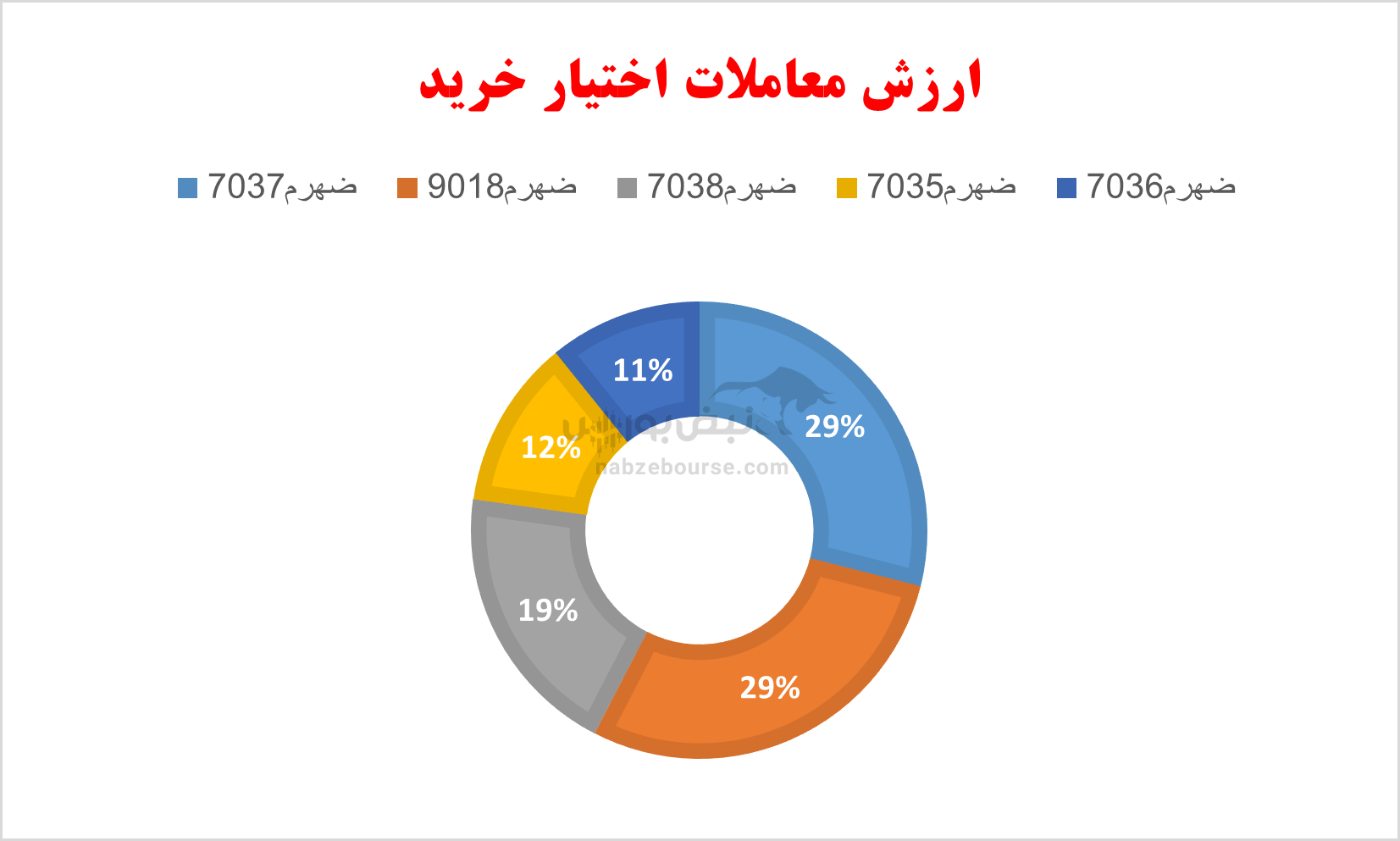 بیشترین ارزش معاملات مربوط به اختیار خرید ضهرم ۷۰۳۷, ضهرم ۹۰۱۸, ضهرم ۷۰۳۸, ضهرم ۷۰۳۵, ضهرم ۷۰۳۶ بوده است. مجموع ارزش معاملات این ۵ اختیار به حدود ۳۴۲ میلیارد تومان رسید.
