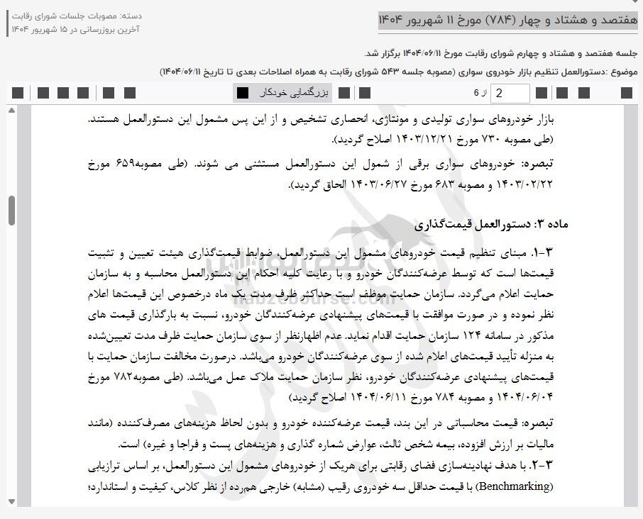 بر اساس مصوبه جلسه ۷۸۴ شورای رقابت (مورخ ۱۱ شهریور ۱۴۰۴)، در ماده ۳ دستورالعمل تنظیم بازار خودروی سواری تصریح شده است که: