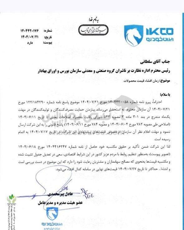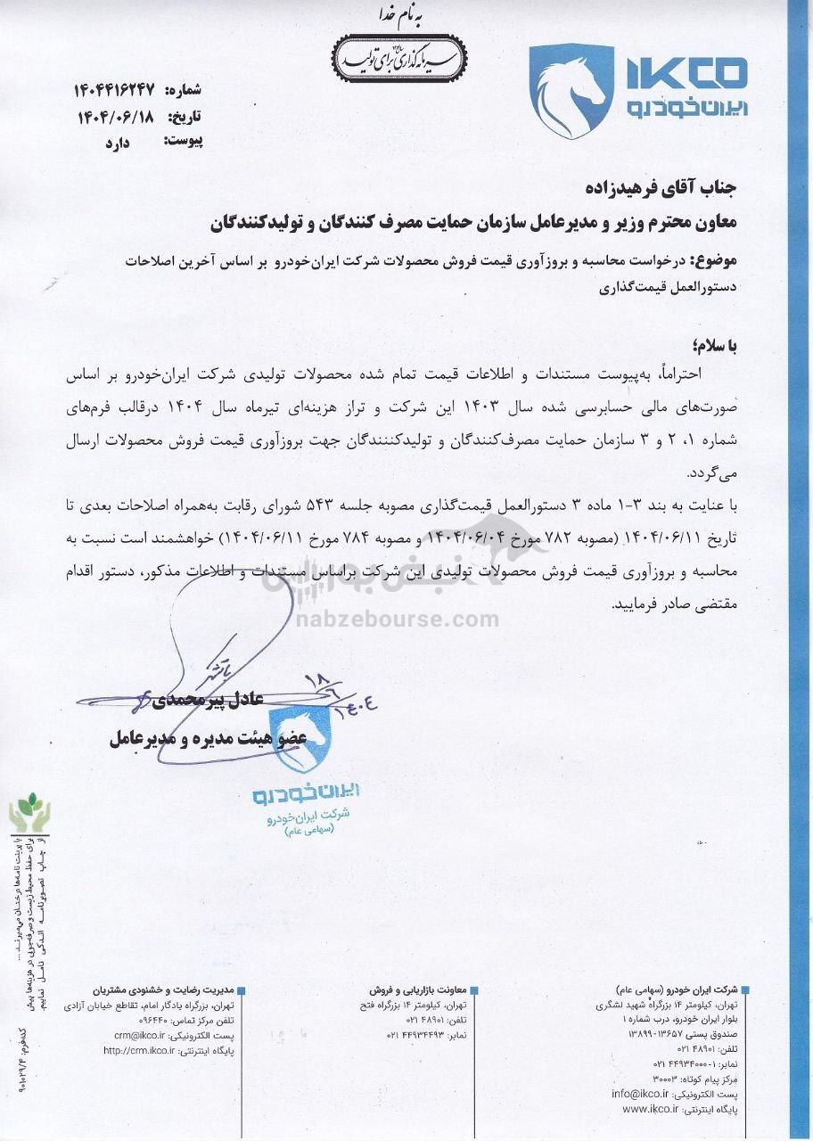 در تاریخ ۱۸ شهریور ۱۴۰۴، شرکت ایران‌خودرو طی نامه‌ای رسمی در سامانه کُدال، درخواست افزایش قیمت محصولات خود را به مراجع ذی‌ربط ارسال کرد.