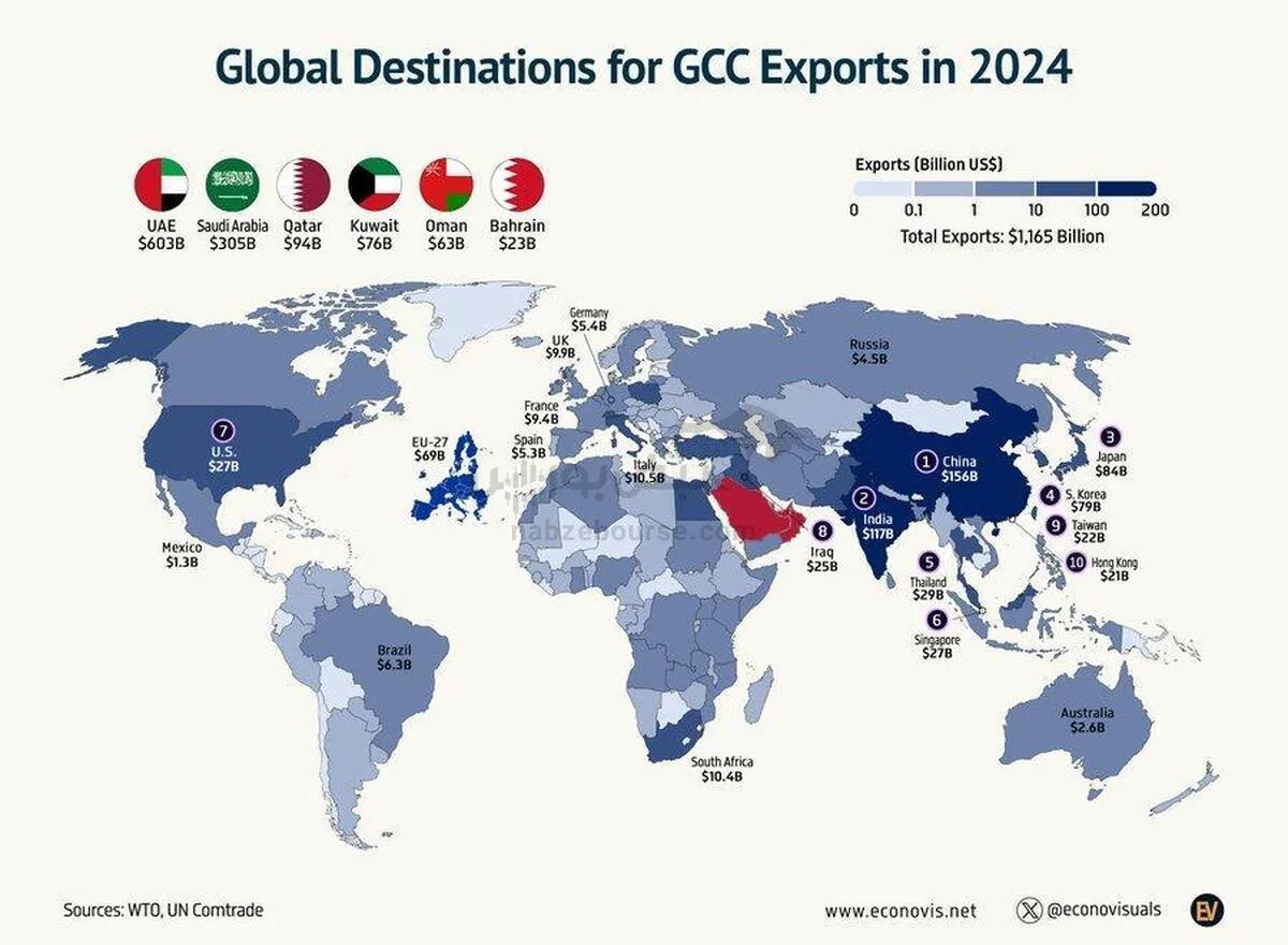 به گزارش نبض بورس، بخش غالب صادرات کشورهای عضو شورای همکاری خلیج فارس (شامل ۸۰ درصد نفت و گاز) به کشورهای آسیایی صورت می گیرد. صادرات این کشورها به چین بیش از ۶۰ درصد مجموع اتحادیه اروپا و آمریکا است.