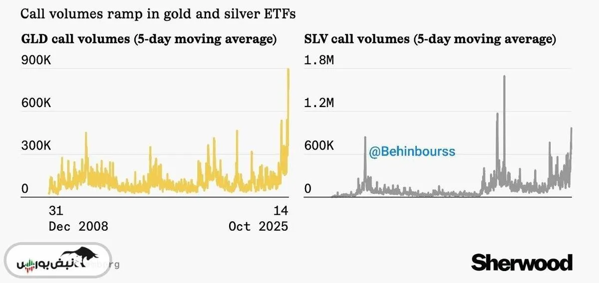 به گزارش نبض بورس، میانگین حجم معاملات آپشنهای خرید (Call Options) روی طلا ($GLD) در ۵ روز گذشته به بالاترین سطح تاریخ رسیده است.
