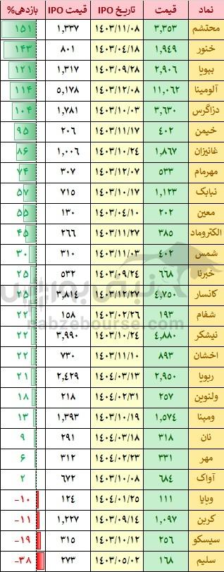 ۱. محتشم با بازدهی ۱۵۱ درصد در صدر فهرست قرار دارد و از جمله عرضههای موفق سال ۱۴۰۳ محسوب میشود.