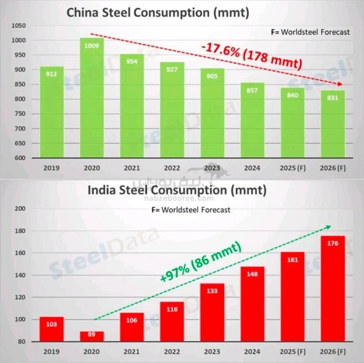 چین در حال ورود به دورهای از کاهش مصرف فولاد است (به دلیل رکود ساختوساز و تعدیل فعالیت صنعتی)، در حالیکه هند بهدلیل رشد اقتصادی و توسعه زیرساختها، بهسرعت در حال تبدیل شدن به عامل اصلی رشد جهانی تقاضای فولاد است.