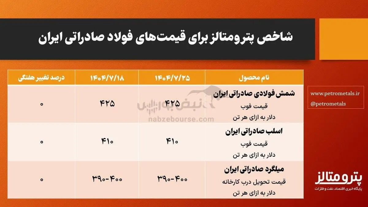 به گزارش نبض بورس، شاخص قیمتهای فولاد صادراتی ایران در هفته منتهی به ۲۵ مهر ۱۴۰۴ منتشر شد. در این هفته، قیمت فوبِ شمش فولادی صادراتی ایران تغییری نداشت و ۴۲۵ دلار به ازای هر تن بود.