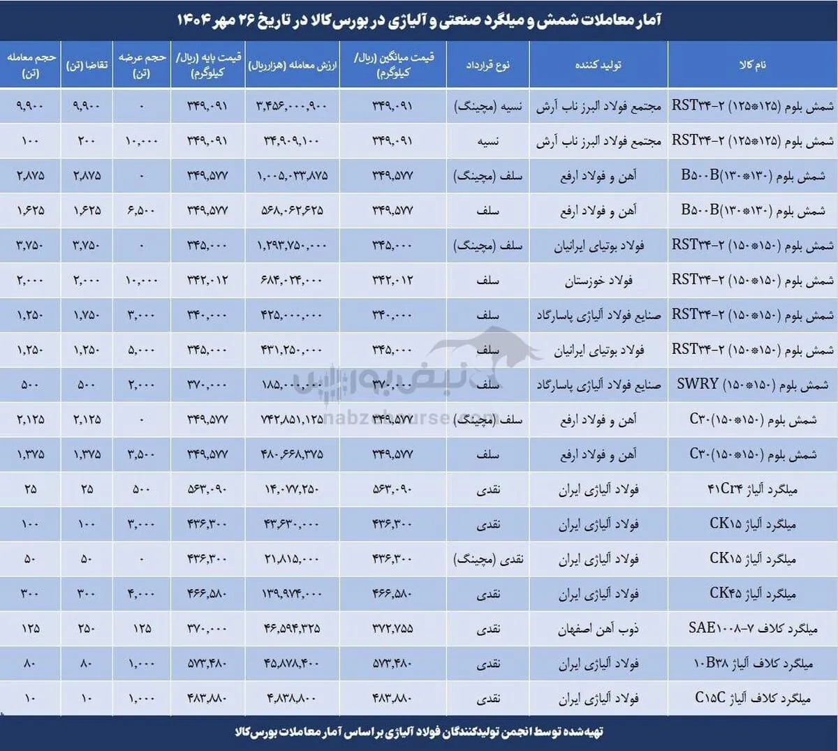 به گزارش نبض بورس و به نقل از انجمن تولیدکنندگان فولاد آلیاژی، در جریان معاملات هفته جاری بورس کالا، حجم کل معاملات شمش و میلگرد صنعتی و آلیاژی به ۲۷,۴۴۰ تن رسید که بخش اعظم آن به معاملات شمش بلوم اختصاص داشت. جزئیات کامل معاملات فولاد صنعتی و آلیاژی در هفته جاری شامل حجم عرضه، حجم معاملات، میزان تقاضا، قیمتها و ارزش معاملات را در جدول فوق ببینید.