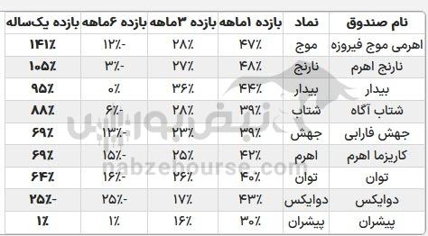 ۱. موج فیروزه: با بازده یکساله ۱۴۱٪ صدرنشین است. با وجود افت ۱۲٪ در بازه ششماهه، در سهماهه اخیر با رشد ۲۸٪ بازگشته و نشاندهنده مدیریت پویا است.