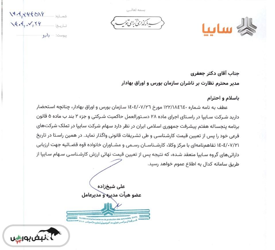 در همين راستا در تاريخ 21 مهر 1404 تفاهم نامه اي با مرکز وکلا، کارشناسان رسمي و مشاوران خانواده قوه قضائيه جهت ارزيابي دارائي هاي گروه سايپا منعقد شده است که نتيجه پس از تعيين قيمت نهائي ارزش کارشناسي سهام سايپا از طريق سامانه کدال به اطلاع عموم خواهد رسيد.