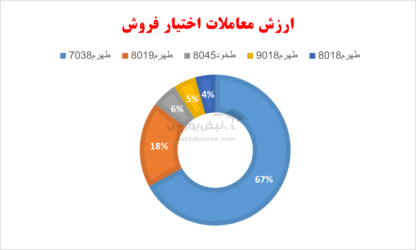 همچنین بیشترین ارزش معاملات در اختیارهای فروش مشابه دیروز به ۵ اختیار طهرم ۷۰۳۸, طهرم ۸۰۱۹, طخود ۸۰۴۵, طهرم ۹۰۱۸, طهرم ۸۰۱۸ در مجموع به مبلغ حدود ۱۶۴ میلیارد تومان مربوط بوده است.
