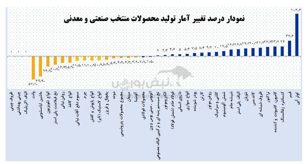 صنایع پایه و سرمایهای مانند فولاد خام و مواد شیمیایی و دارویی توانستهاند روند تولید خود را حفظ کنند، در حالی که محصولات پتروشیمی کاهش تولید داشتهاند.