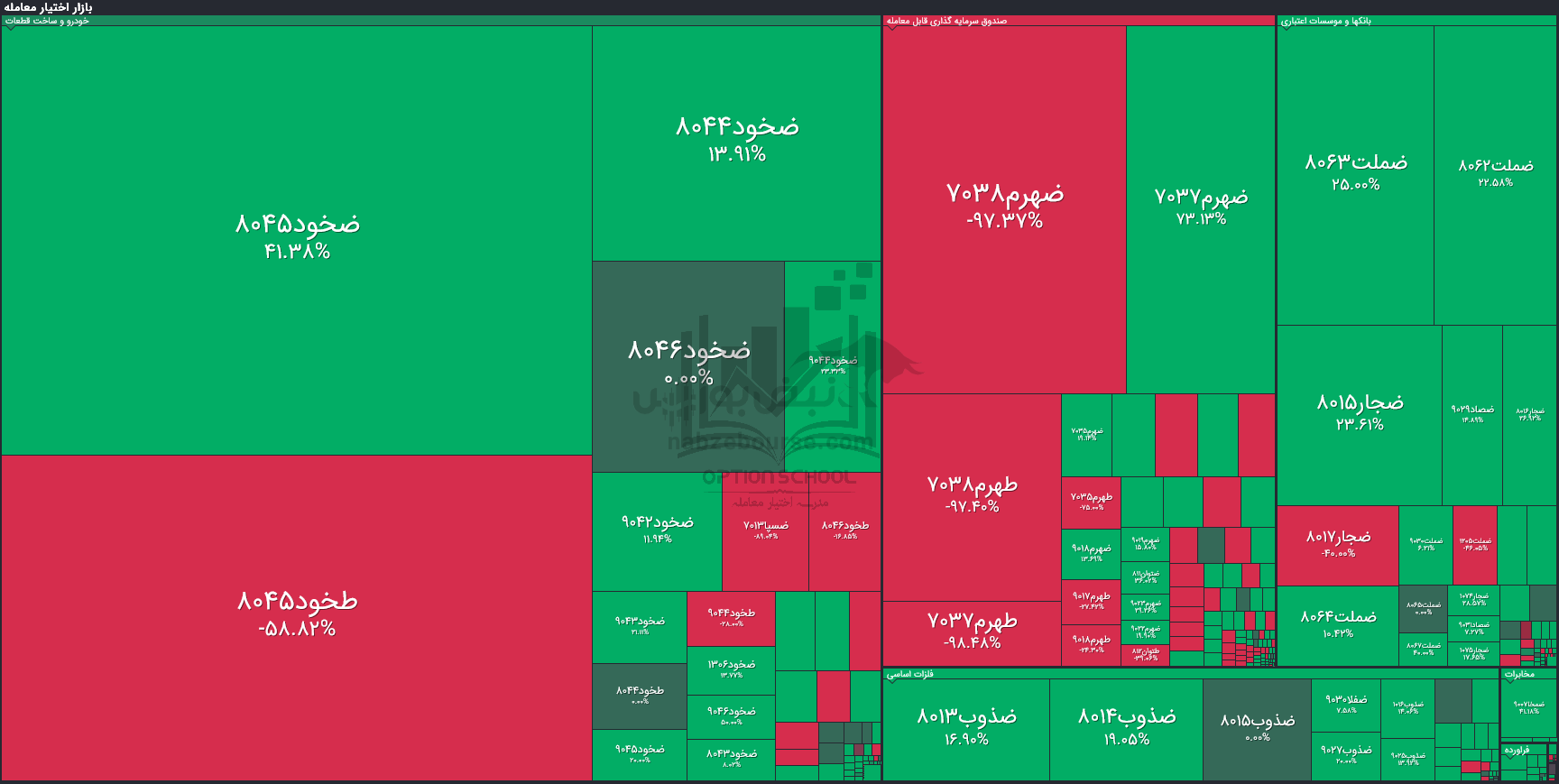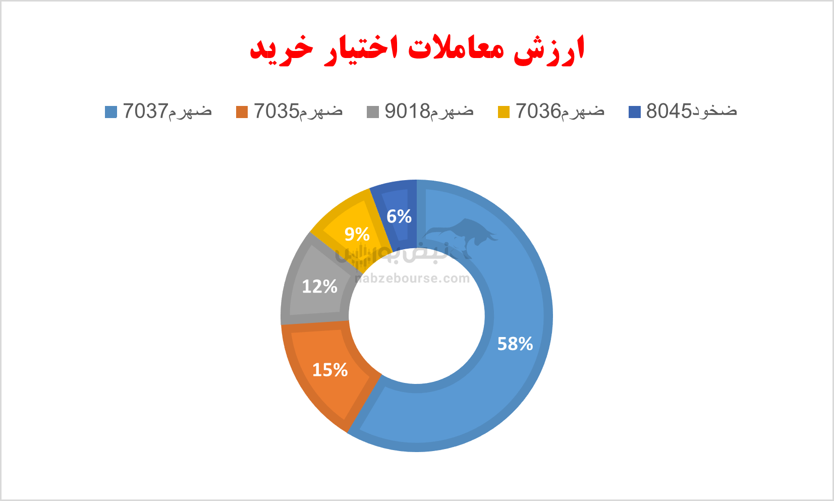 بیشترین ارزش معاملات مربوط به اختیار خرید ضهرم ۷۰۳۷, ضهرم ۷۰۳۵, ضهرم ۹۰۱۸, ضهرم ۷۰۳۶, ضخود ۸۰۴۵ بوده است. مجموع ارزش معاملات این ۵ اختیار به حدود ۵۸۴ میلیارد تومان رسید.
