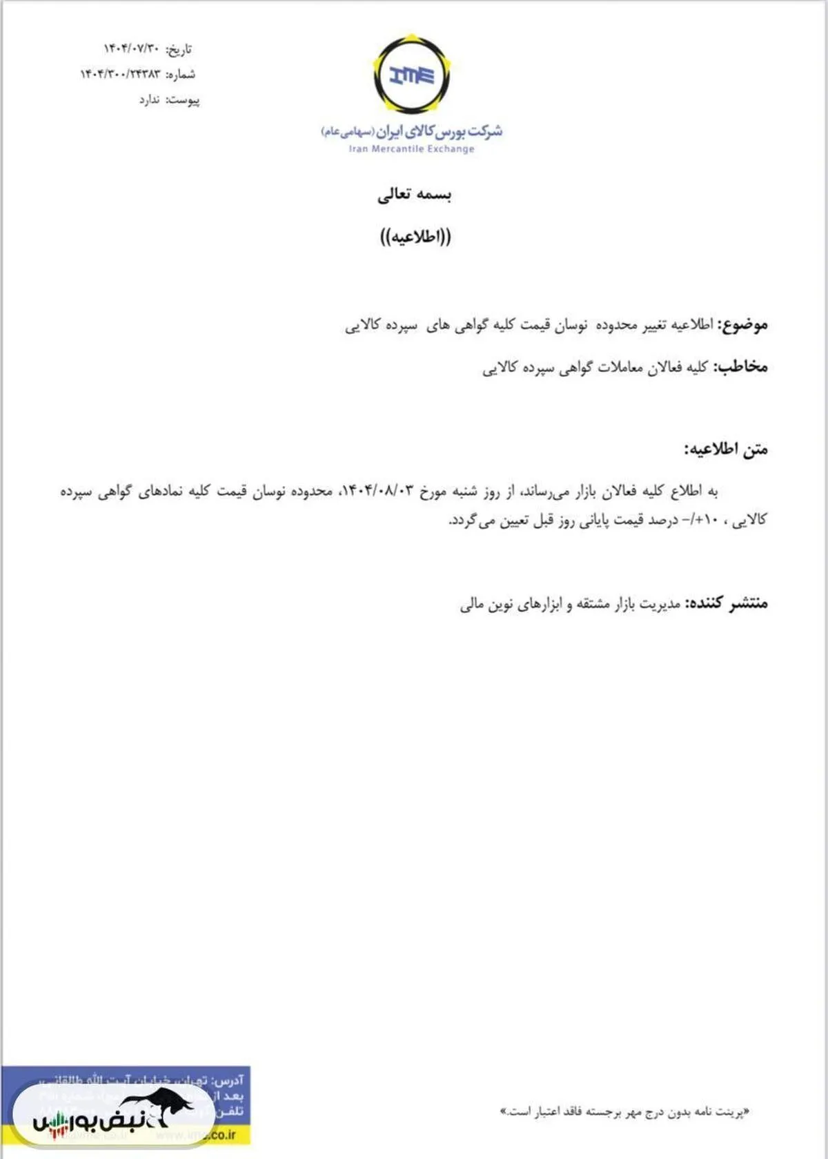 اطلاعیه تغییر محدوده نوسان قیمت کلیه گواهی های سپرده کالایی