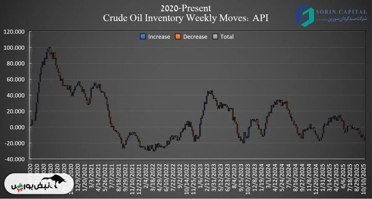 به گزارش نبض بورس، طبق برآورد American Petroleum Institute (API)، ذخایر نفت خام آمریکا هفته منتهی به 24 اکتبر 4 میلیون بشکه کاهش یافت، در حالی که تحلیلگران انتظار داشتند کاهش 2.9 میلیون بشکه‌ای رخ دهد. همچنین، ذخایر بنزین 6.3 میلیون بشکه و ذخایر دیستیل 4.4 میلیون بشکه کاهش یافت.