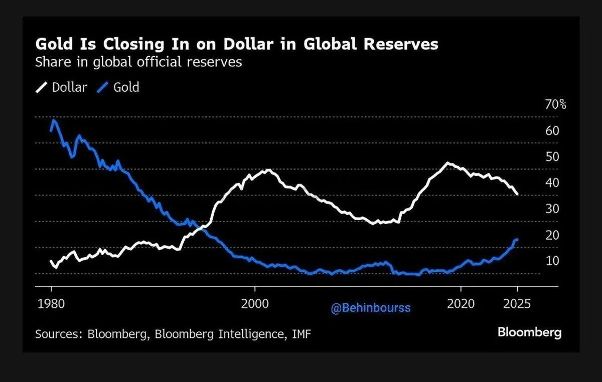 به گزارش نبض بورس، به نقل از بلومبرگ، سهم طلا در ذخایر ارزی جهانی به سرعت در حال افزایش است و در آستانه رسیدن به سطح دلار آمریکا قرار دارد.