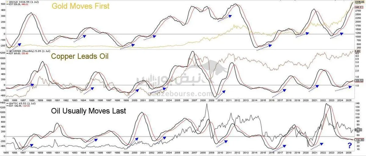 طبق تصویر این چرخه به مدت ۴۰ سال همینطور بوده و در حال حاضر، مس در حال جهش است در حالی که نفت هنوز حرکتی نکرده است.