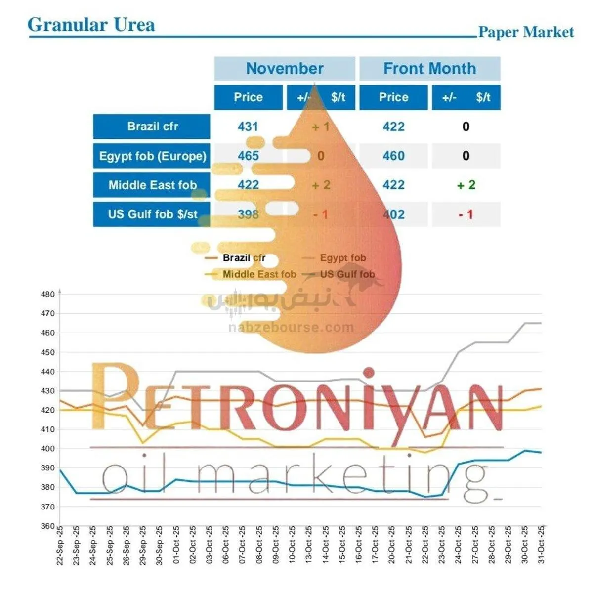 به گزارش نبض بورس، نرخ روزانه ی اوره گرانول فوب خاورمیانه، CFR برزیل، فوب مصر و خلیج ایالات متحده آمریکا،31 اکتبر 2025